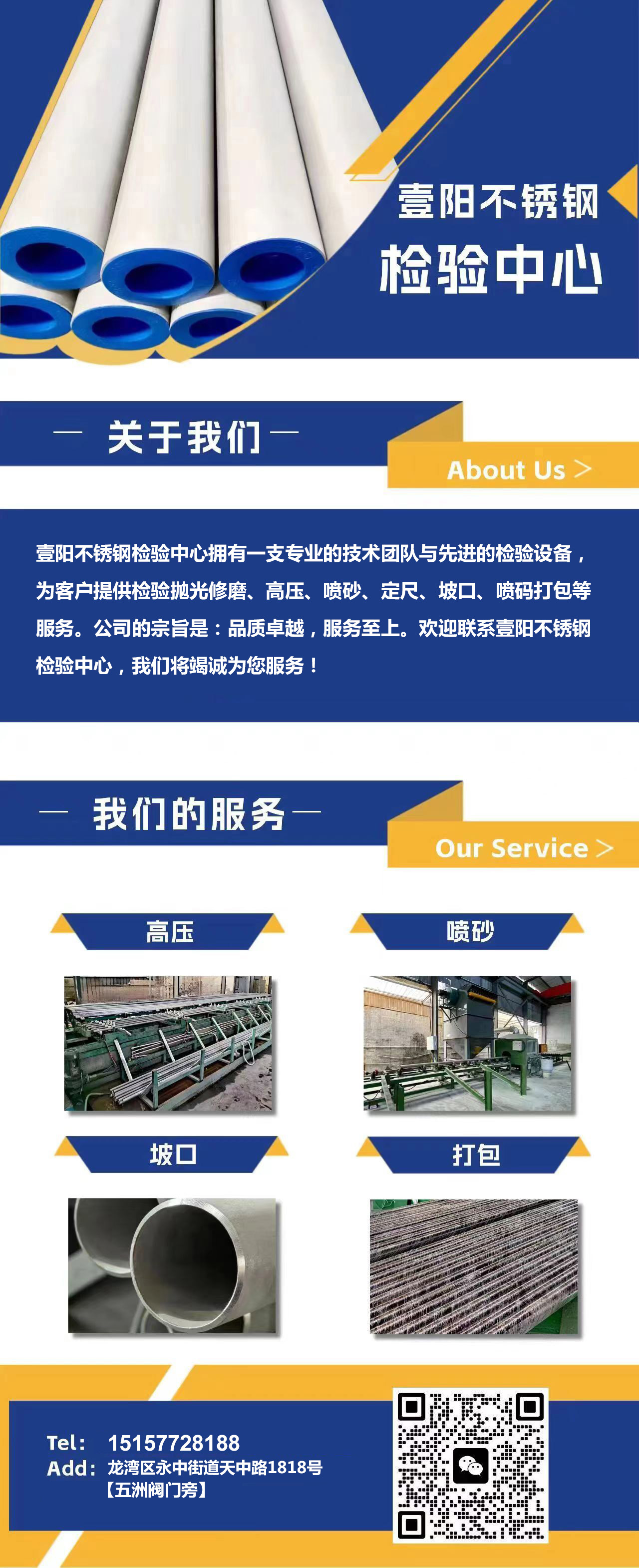 壹陽(yáng)不銹鋼:檢驗(yàn)中心對(duì)外加工:拋光、修磨、高壓、噴砂、定尺、坡口、噴碼打包。專線:15157728188 |